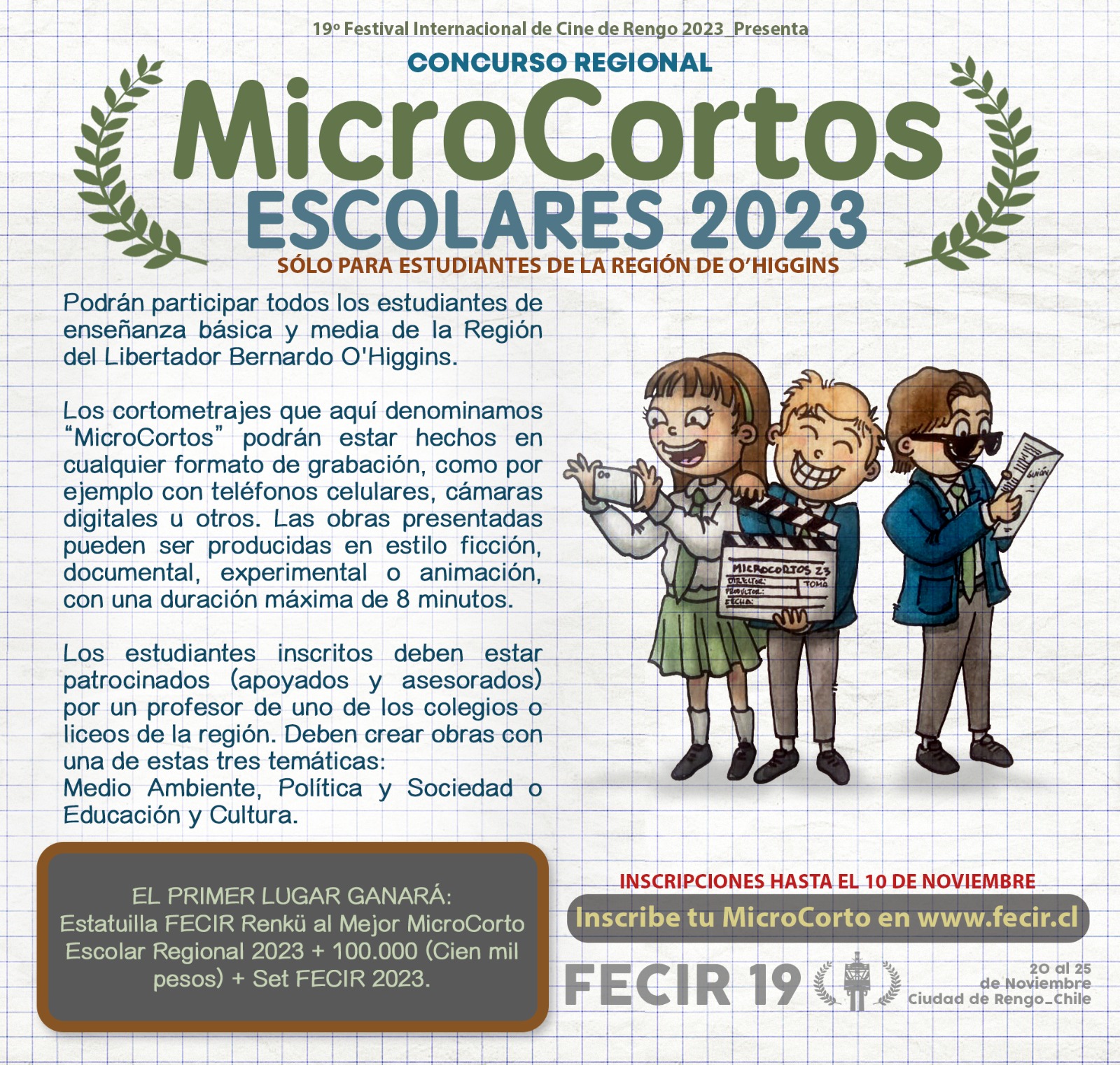 Una muy buena noticia para los estudiantes de la Región de O’Higgins, ya que el “19º Festival Internacional de Cine de Rengo 2023” abrió la convocatoria para “MicroCortos” Escolares 2023. El llamado es a no perderse la oportunidad de participar en el prestigioso Festival Internacional de Cine, ya que se pueden ganar grandes premios y la posibilidad de ser parte del certamen en el mes de noviembre.