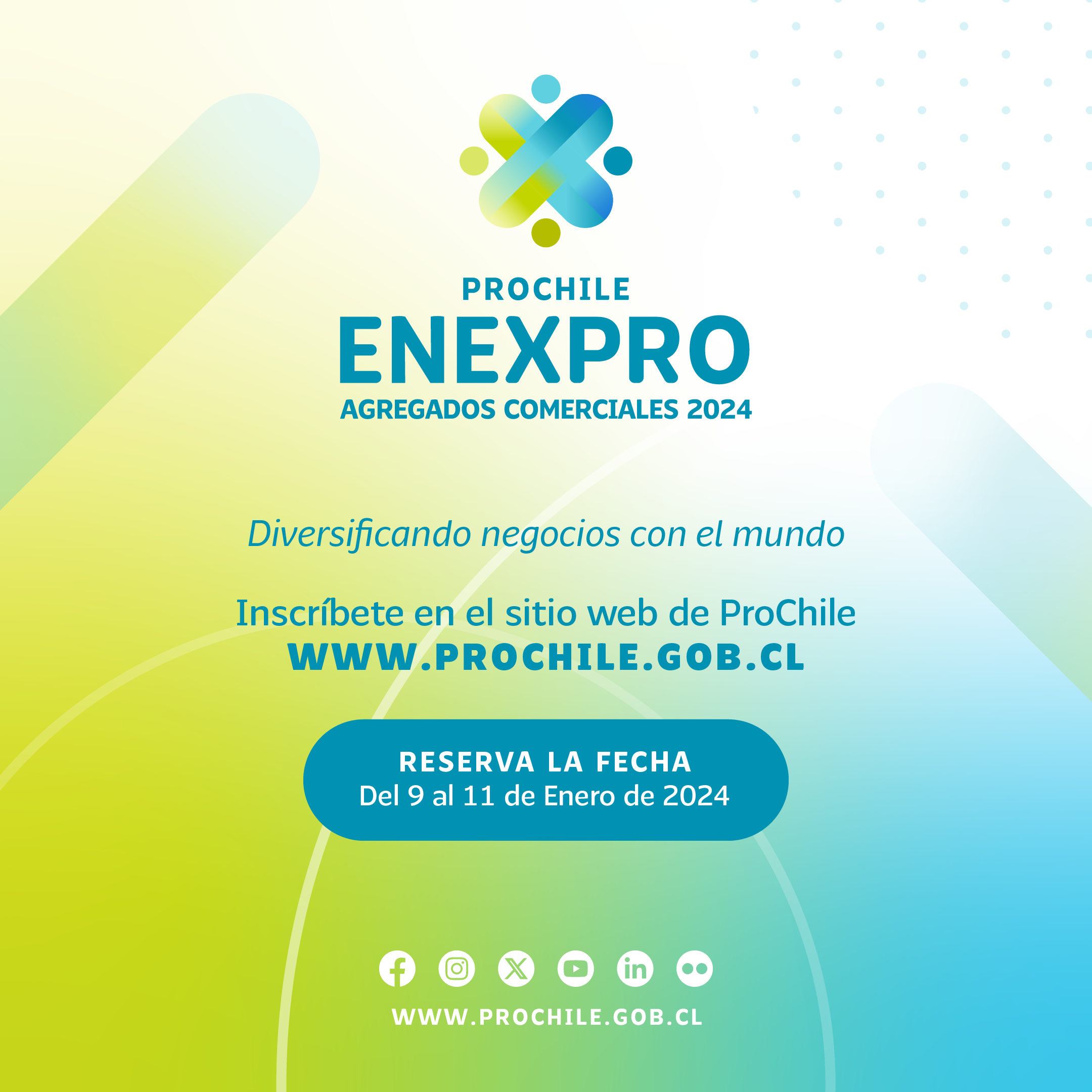 “Este evento marca el inicio de nuestras actividades de celebración por los 50 años de ProChile en 2024. Hemos querido comenzar trayendo a nuestros agregados comerciales para que puedan transmitir de primera fuente las tendencias y oportunidades en sus mercados y juntos seguir diversificando nuestros envíos al mundo. Este será un espacio que permitirá conocer las oportunidades existentes en 21 mercados de Asia, Europa, América del Norte, América del Sur, Centro América y Caribe, donde ProChile cuenta con oficinas comerciales. Participar no tendrá costos para los exportadores. Los invito a que esta instancia sea provechosa para todos y todas”, explica Ignacio Fernández, director general de ProChile.