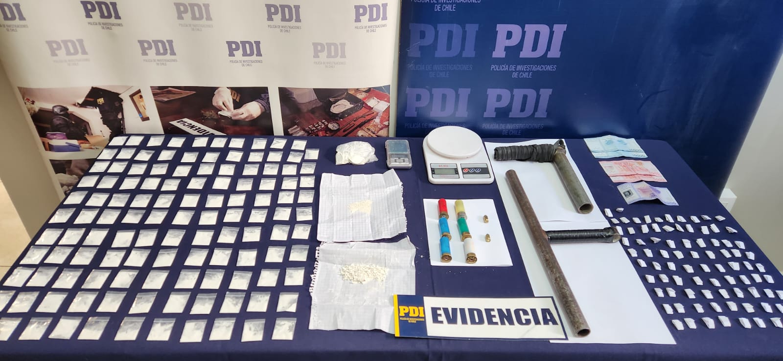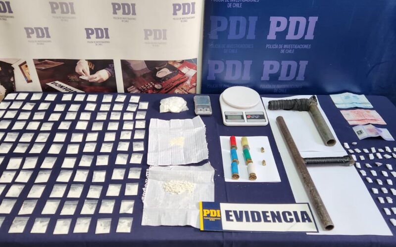 Tras los allanamientos efectuados durante la tarde del martes, la PDI encontró cocaína base avaluada en 2,4 millones de pesos, además de dos balanzas digitales, una escopeta de fabricación artesanal, munición de diversa calibre y 33 mil pesos, aparentemente obtenidos de la venta de droga.